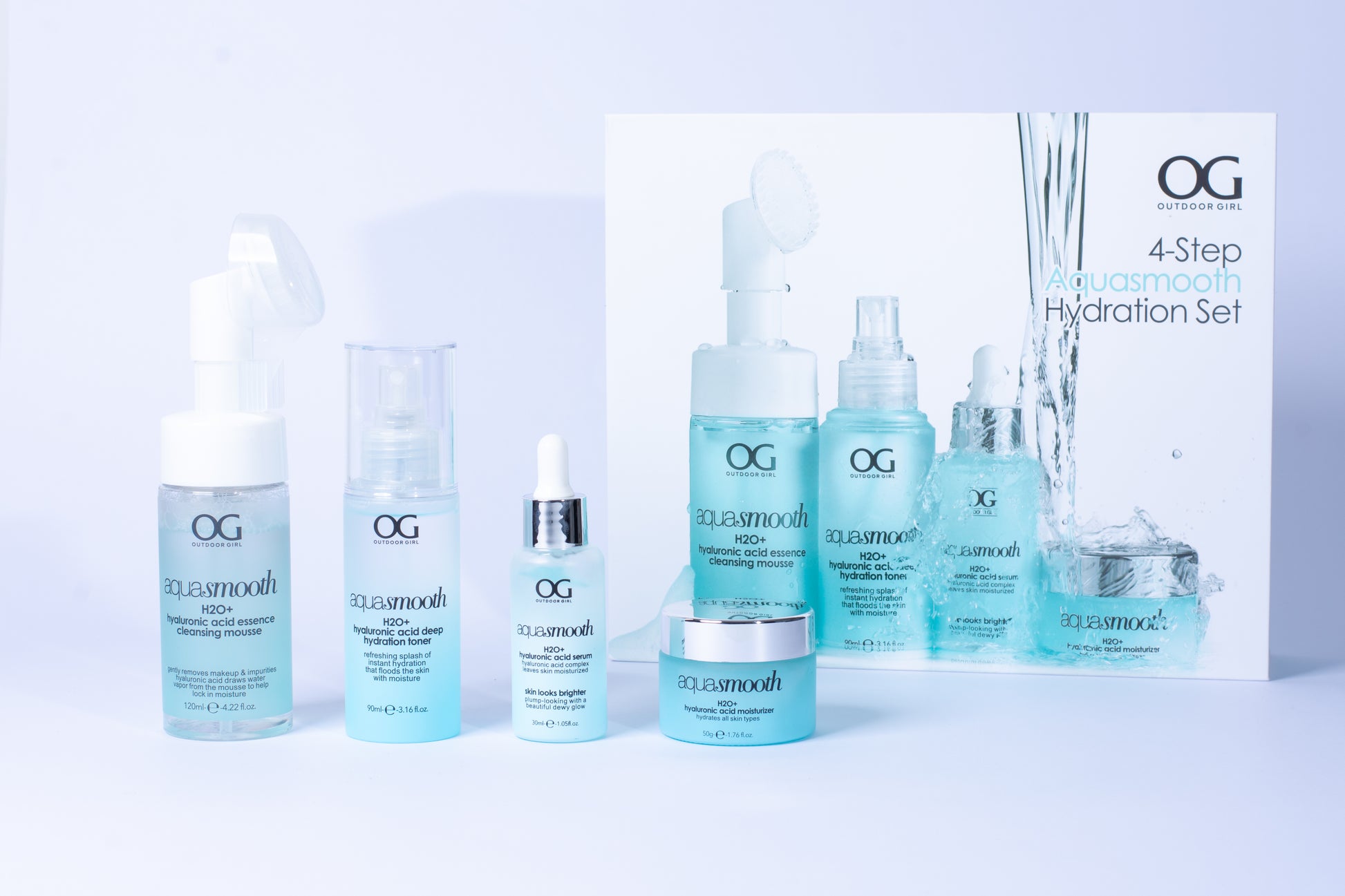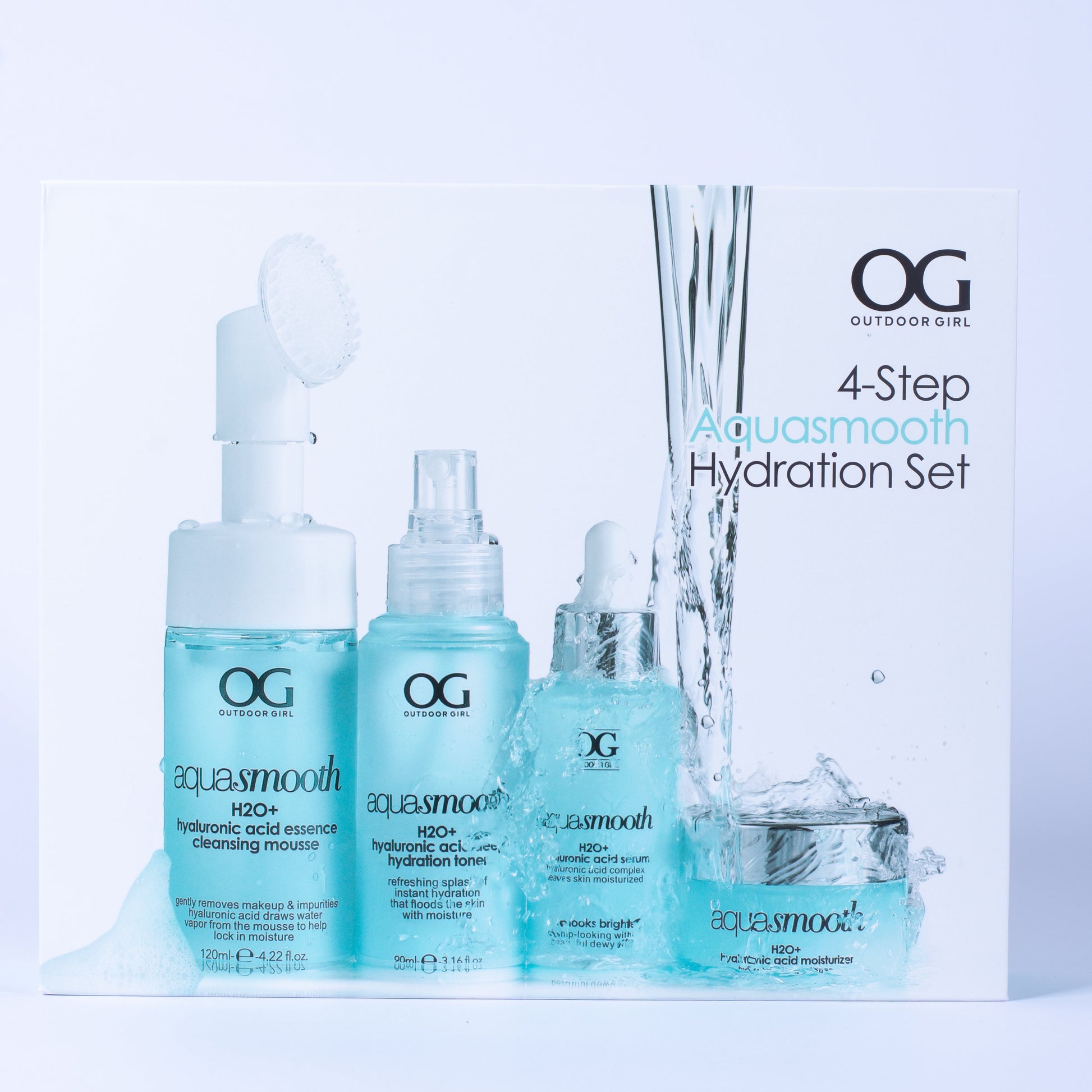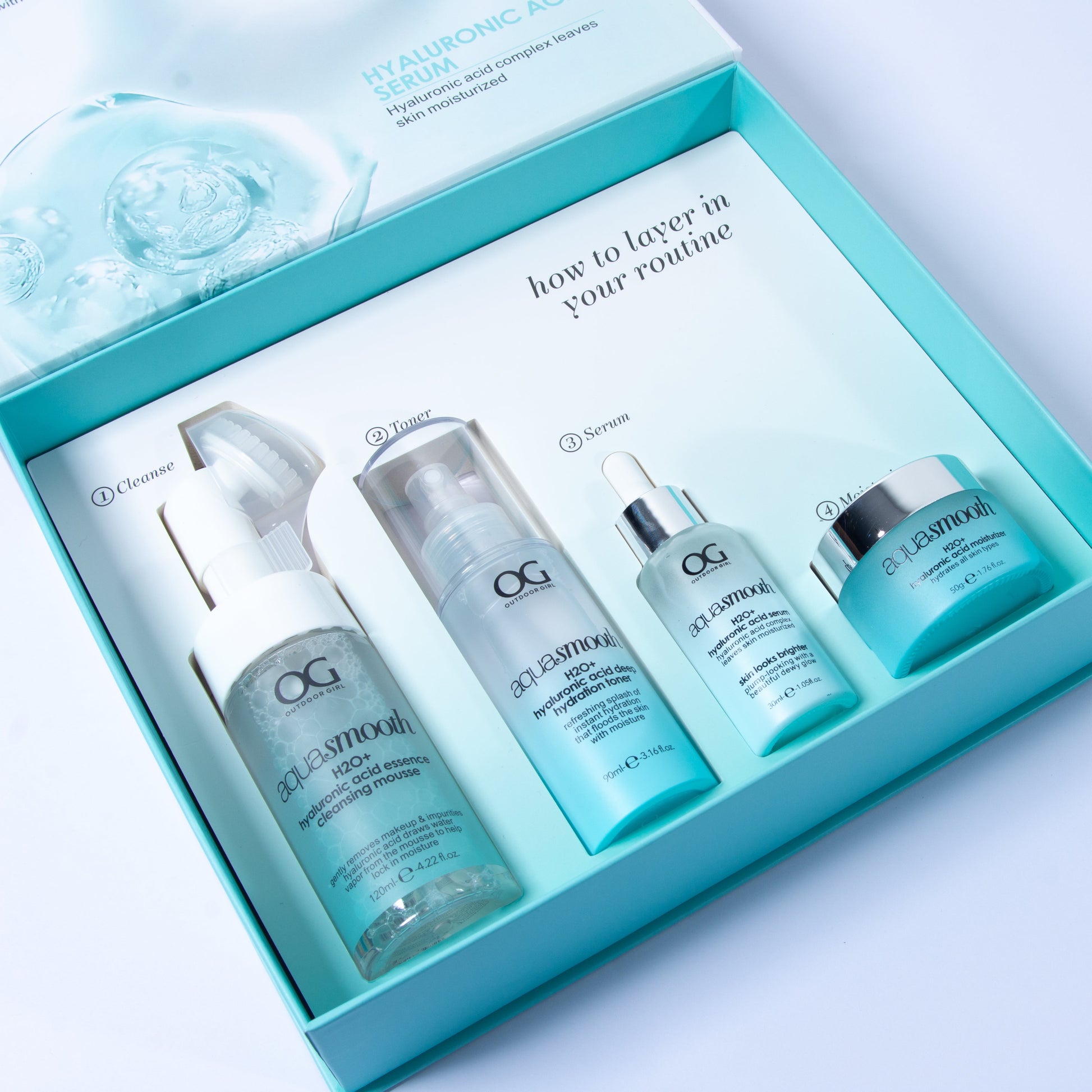 El Kit Skincare de Ácido Hialurónico combina limpieza, tonificación, tratamiento e hidratación en una rutina completa.